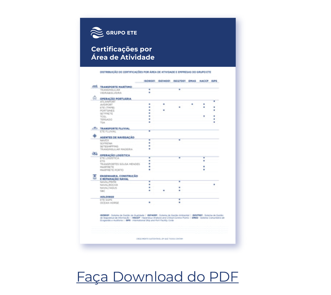 No Grupo ETE, o nosso compromisso com o futuro é total, por isso, trabalhamos de forma integrada para otimizar continuamente todos os aspetos ligados à Qualidade, à Segurança e à Sustentabilidade da nossa atividade. Uma estratégia coesa, assente no cumprimento rigoroso com os princípios internacionais para estas áreas, e também na inovação constante.